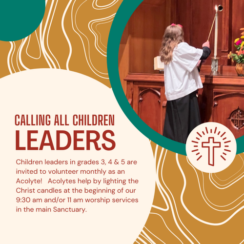 Acolyting is a meaningful leadership experience for children in 3rd, 4th, and 5th grade. This role offers a unique opportunity to take an active part in worship by lighting the Christ candles at the beginning of our services in the main sanctuary. As acolytes, children will wear a special robe and cotta provided for them. This important role not only enhances the worship experience but also often becomes a treasured part of their children’s church journey.